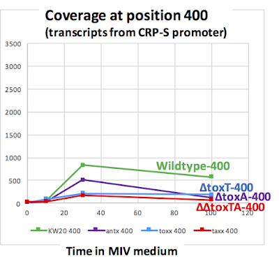 A few months ago I wrote a post about evidence that ToxA prevents transcription of the toxTA operon from an unexpected internal promoter. Here's a better version of the graph I showed there (note that transcription is going from right to left):