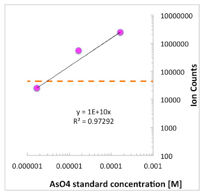 The lines with open symbols show the amount of arsenate in each of these fractions - these lines are hard to see because they're sitting right on top of the X-axis (yes, that means that the amounts of arsenate detected are ~ zero 'ion counts'). The real values aren't necessarily zero, but they're below the detection limit for this experiment.